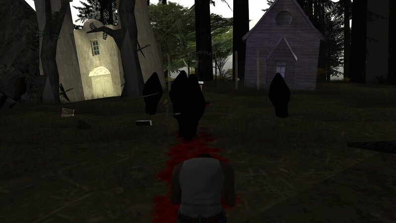 A new version of The House of the Death, now called The Cemetery of the Death, located southwest of San Andreas, specifically between Shady Creeks and Whetstone, features two churches and a private priest's cottage with its corresponding cemetery. The priest is seen praying before a crucified grave. Later, accompanied by tears, he looks at CJ, but unfortunately, those tears change everything. The priest is decapitated, the sky turns black and white, and CJ begins coughing and vomiting blood. Four armed ghosts appear, and at the same time, a faceless ghost emerges from an open grave in the cemetery behind and walks toward the grave where the priest was praying. Due to CJ's blood and energy loss, the faceless ghost revives, and the four armed ghosts become invisible and attack CJ. Be careful with them, as the ghosts are immune, and the Faceless Man will be difficult to defeat because once they capture CJ, he'll have no escape. With a bit of luck, if CJ manages to kill the Faceless Man, he'll revert to a ghost, the sky will turn black and white, and the four Faceless Ghosts will become visible again. The Faceless Ghost Man will return to his open grave, where it will all end, the sky will brighten, and everything will return to normal. CJ can also hold out until dawn; once the sun rises, the ghosts and the Faceless Man will instantly vanish. Once everything is back to normal, the priest will resurrect and return to the church.